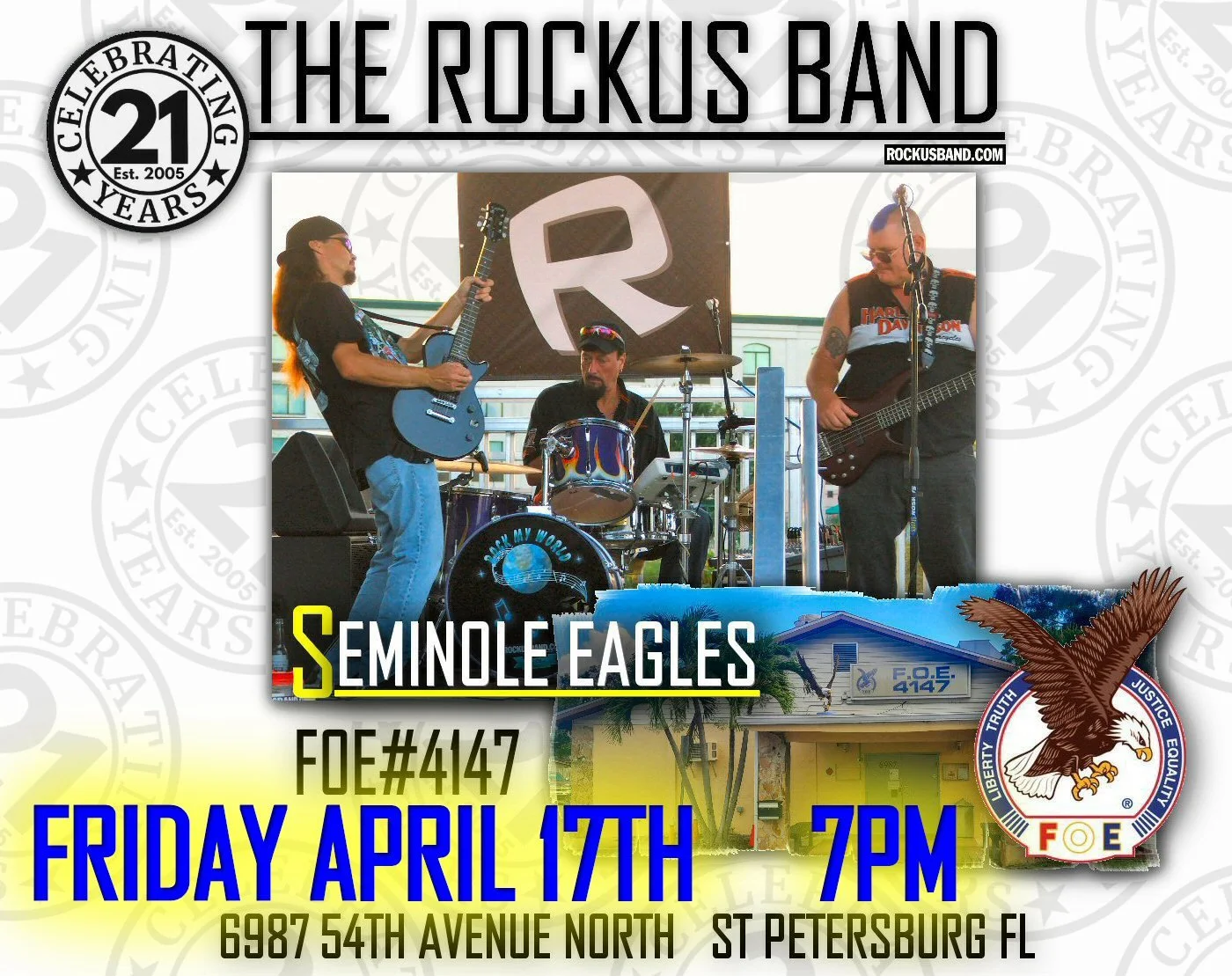Join THE ROCKUS BAND for ROCKUS @ THE EAGLES #4147 in St Petersburg! CHEAP DRINKS and GOOD PEOPLE! ALL ARE WELCOME! (no need to be a member to attend)