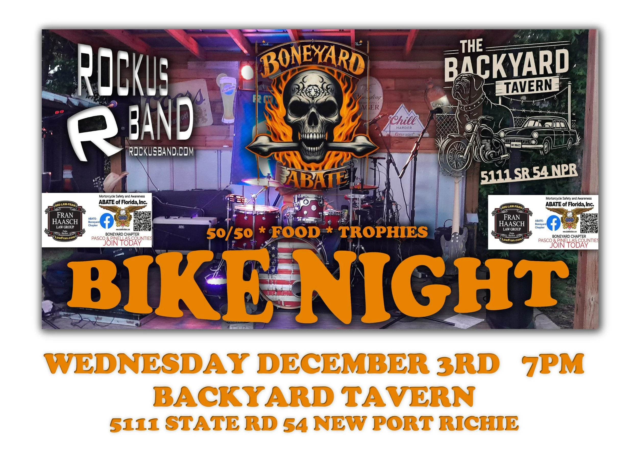Join us for BIKE NIGHT @ THE BACKYARD TAVERN! 50/50, FOOD, TROPHIES….Ride on up and come hangout in our Backyard!